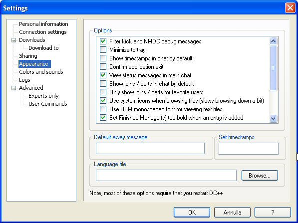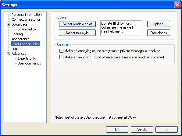 Here you can set colours and font,nothing important. restart DC++ is required if you change something