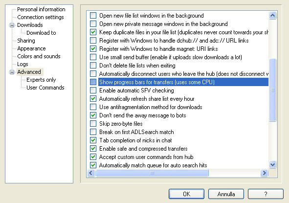 These are the most important settings on DC++. Take a look to the blue lines. Uncheck the show progress bars,it saves cpu resource.